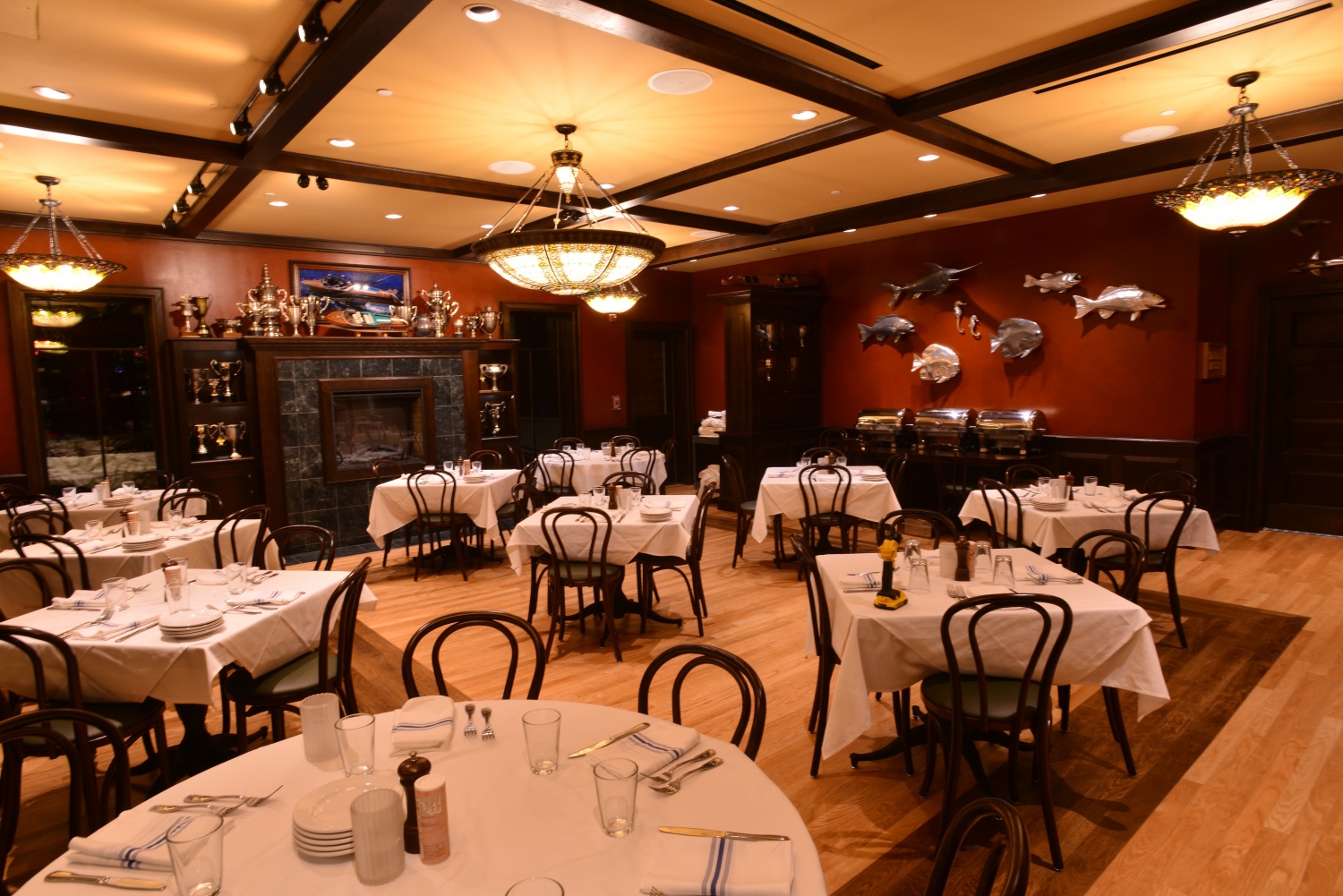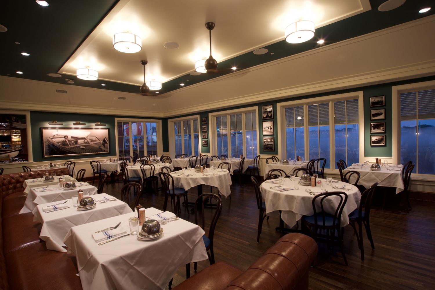 There are three bars, including a raw bar, a more intimate library bar, and an exterior dock bar overlooking marina. The Boathouse also features a $2 million inventory of dream boats from the 30s, 40s and 50s on display, along with amphicar and Italian water taxi rides.