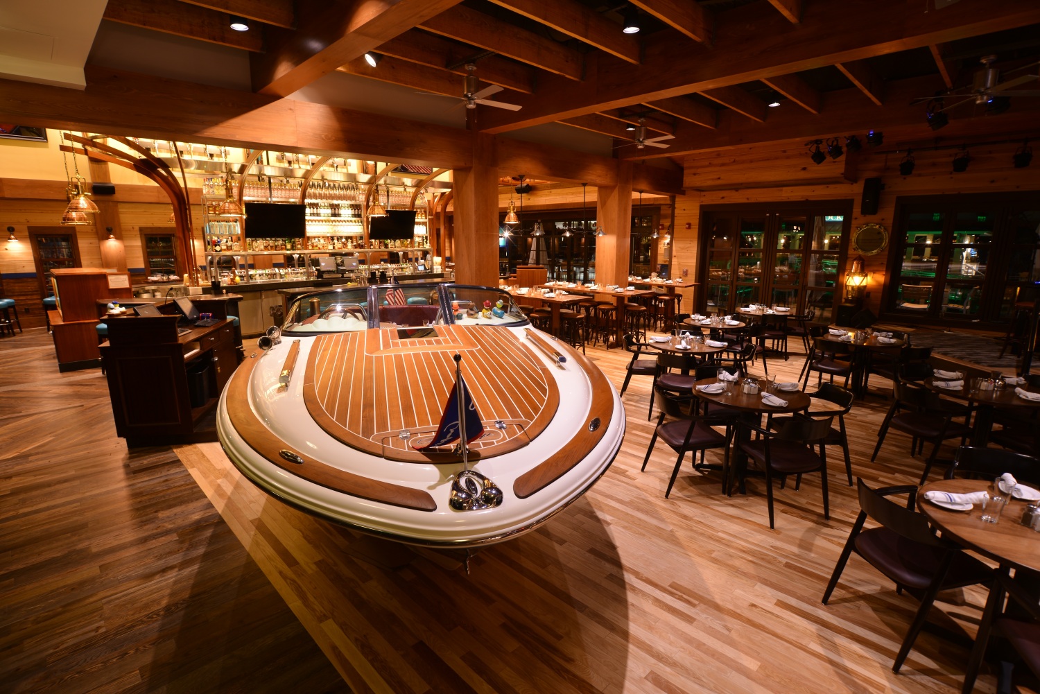 The Boathouse is an 18,000 SF, themed restaurant at Disney Springs that includes a 5,000 SF kitchen and 1,000 SF of retail space. The facility can seat over 400 people in six themed dining rooms, and an additional 200 exterior seats are located on the boardwalk and floating docks.