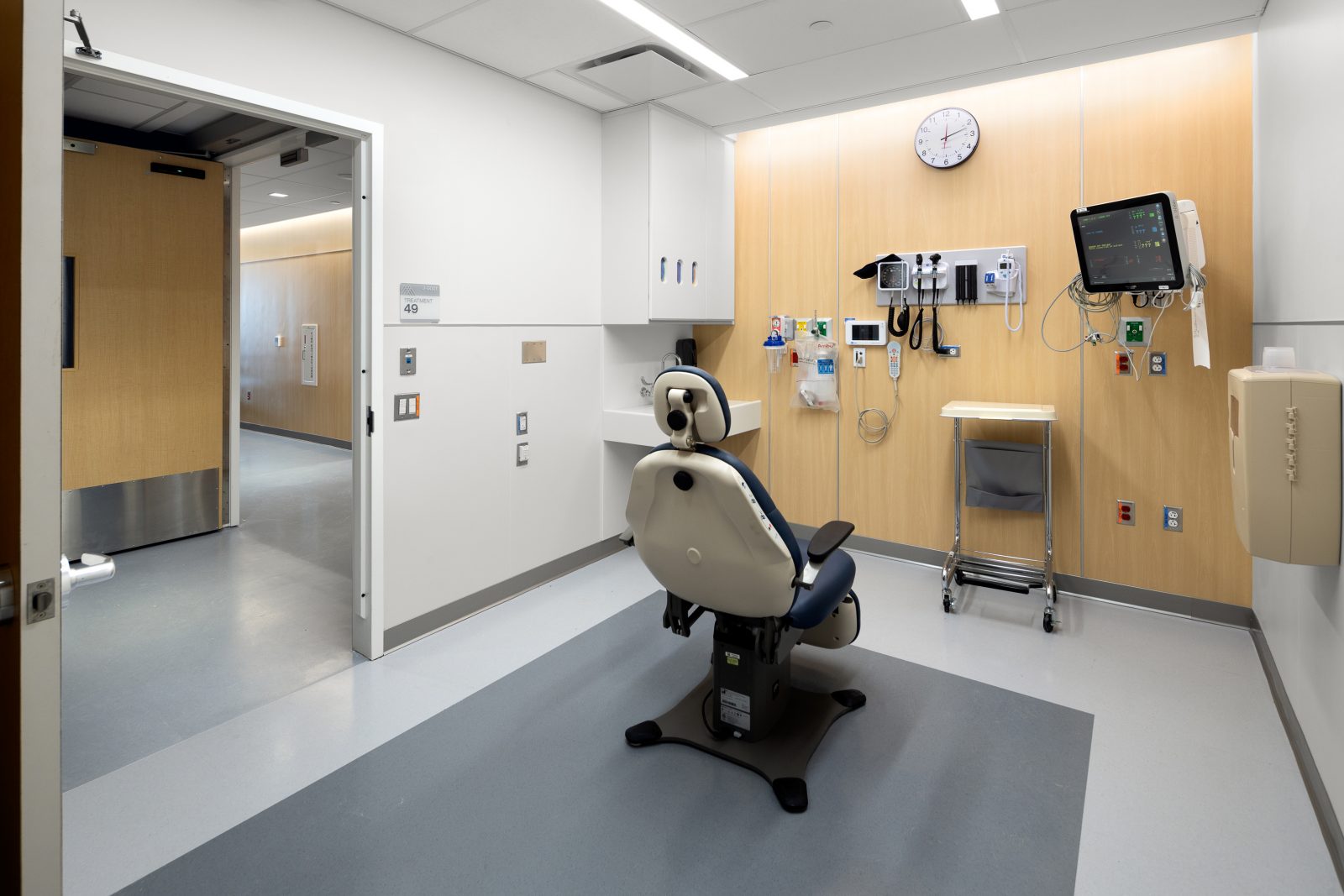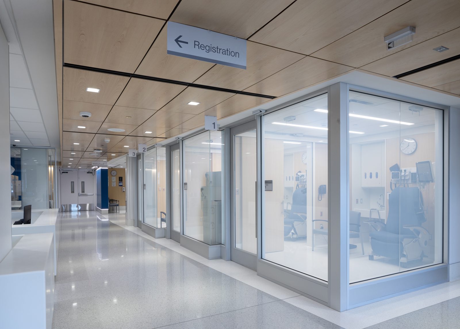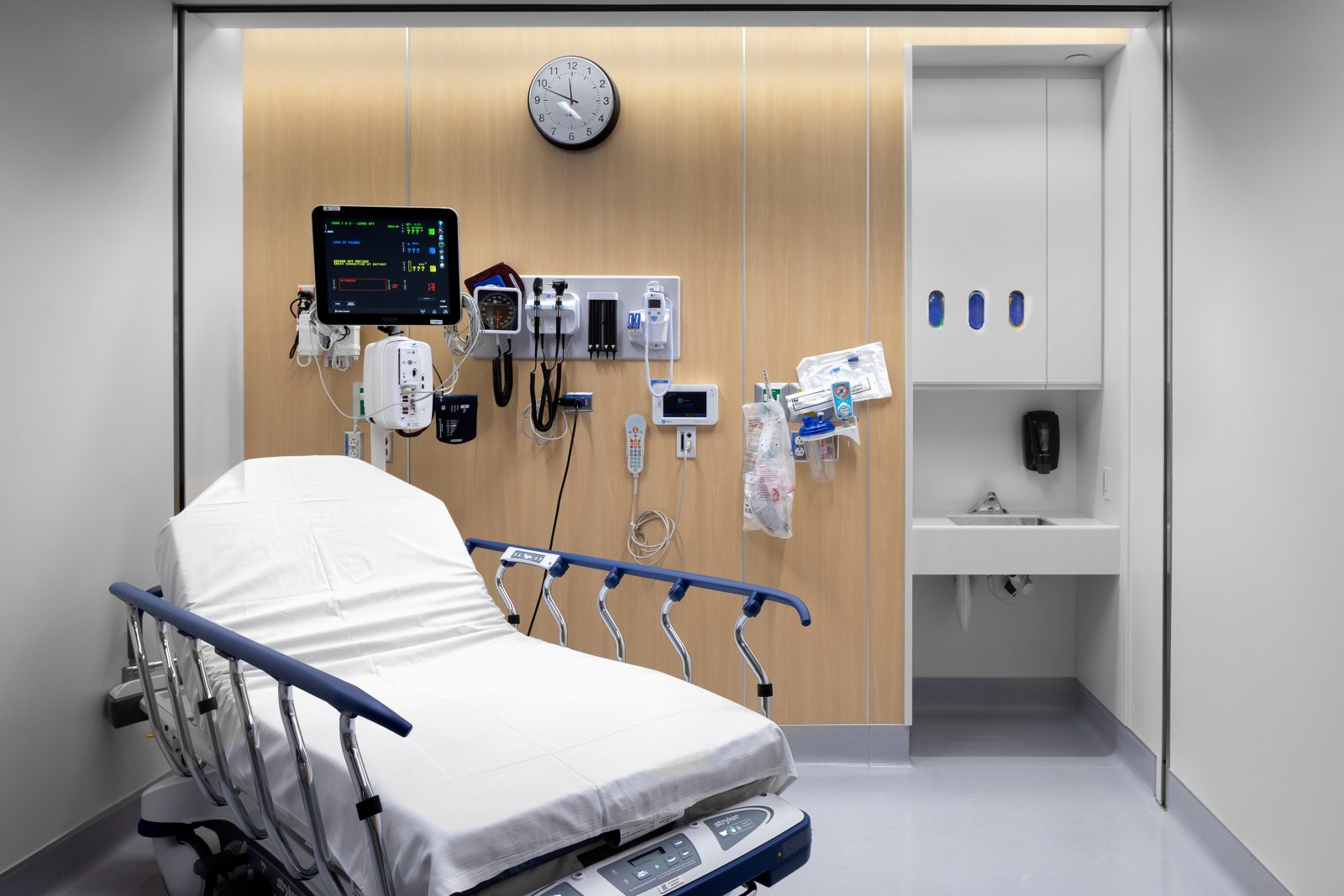 At Mount Sinai South Nassau, the 100,000 SF bed tower includes an expansion of the emergency and surgical departments along with a new critical care unit. The upgraded emergency department is designed to accommodate approximately 80,000 patients annually. For improved accessibility, elevators located in both the units and the adjacent patient tower provide direct travel between each area, connected by a two-story bridge. This bed tower includes: