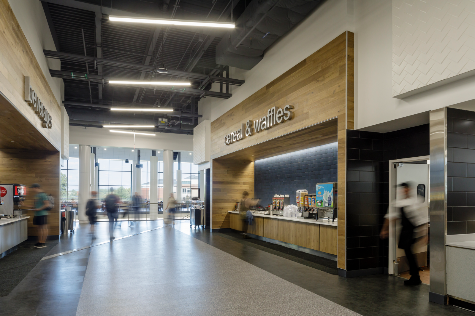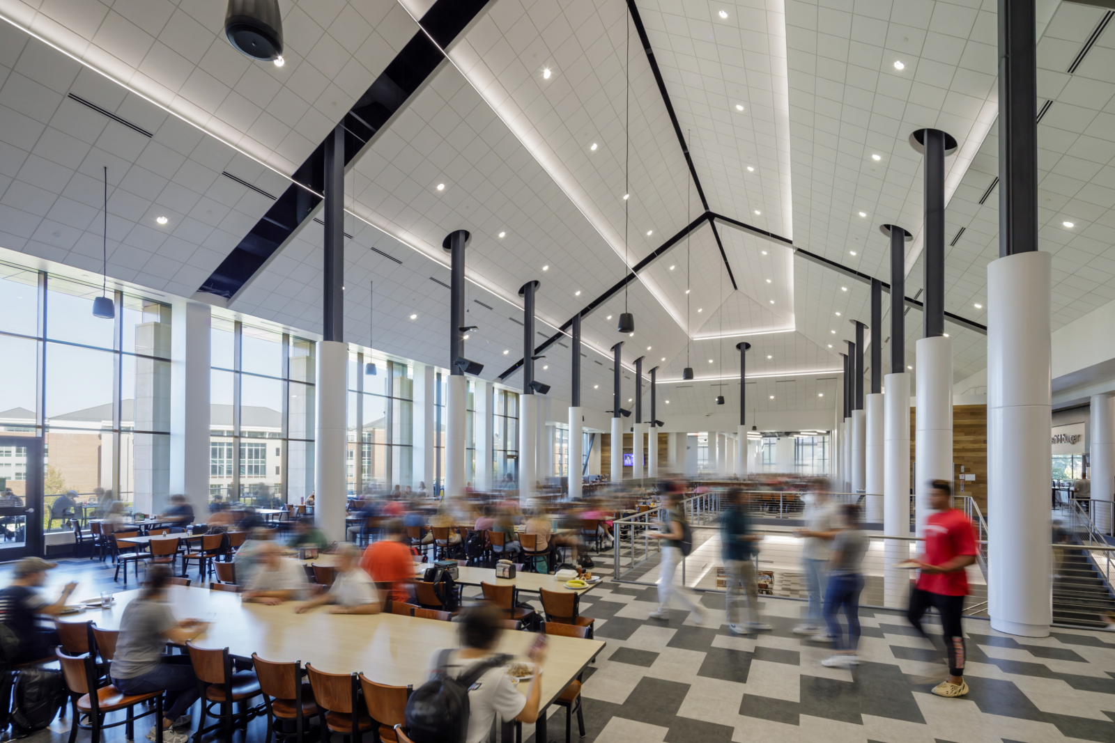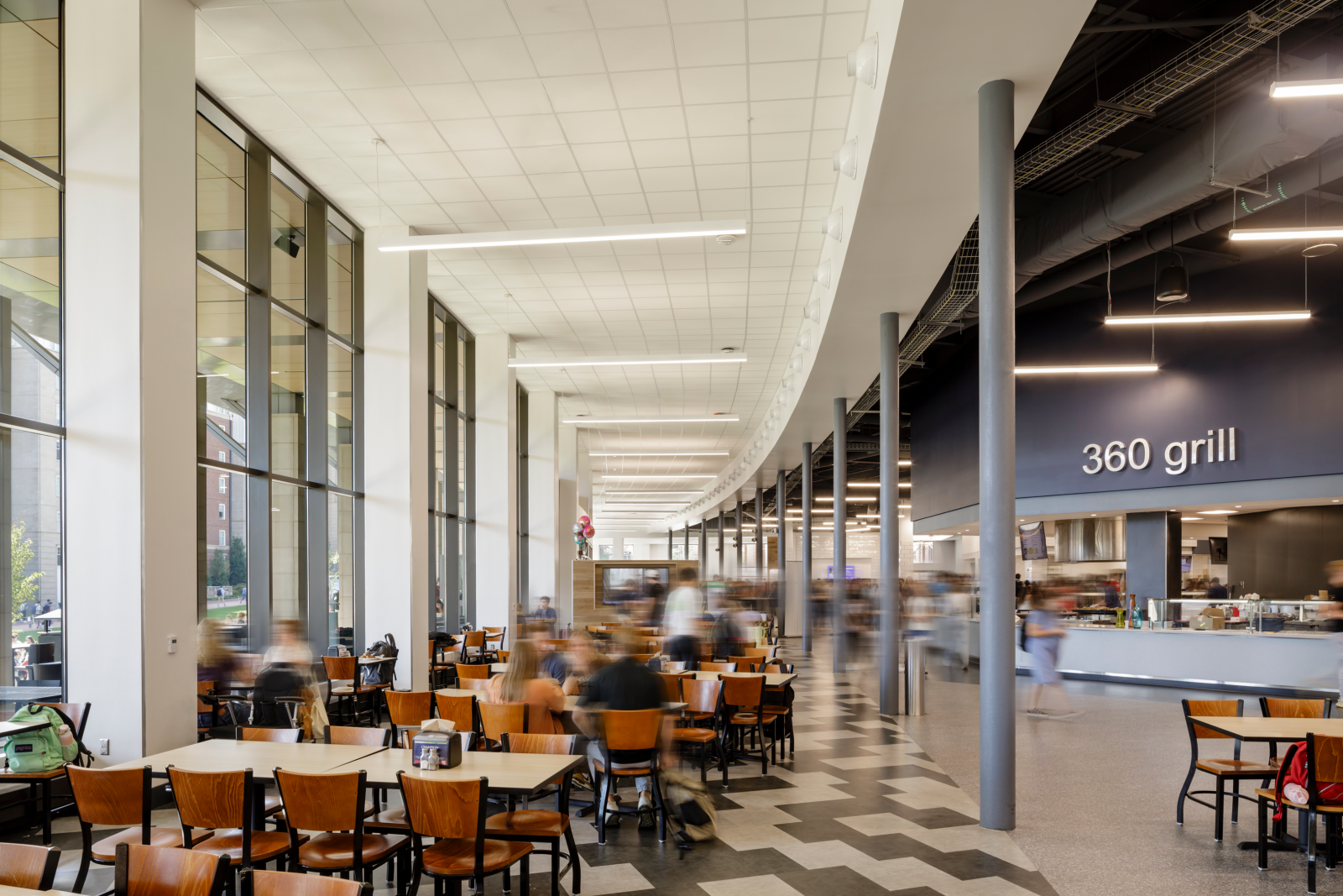 At Liberty University, the two-story dining center features indoor and outdoor seating, along with 28 food service stations. It’s the only dining facility on the university campus and serves the entire student population during breakfast, lunch and dinner. The center also hosts cooking classes and pop-up stations where chefs offer students the chance to try different foods. The dining center includes: