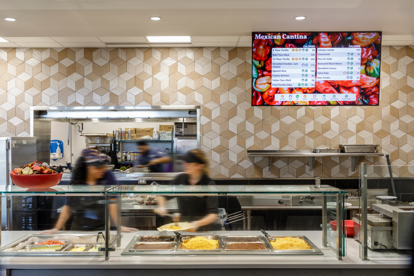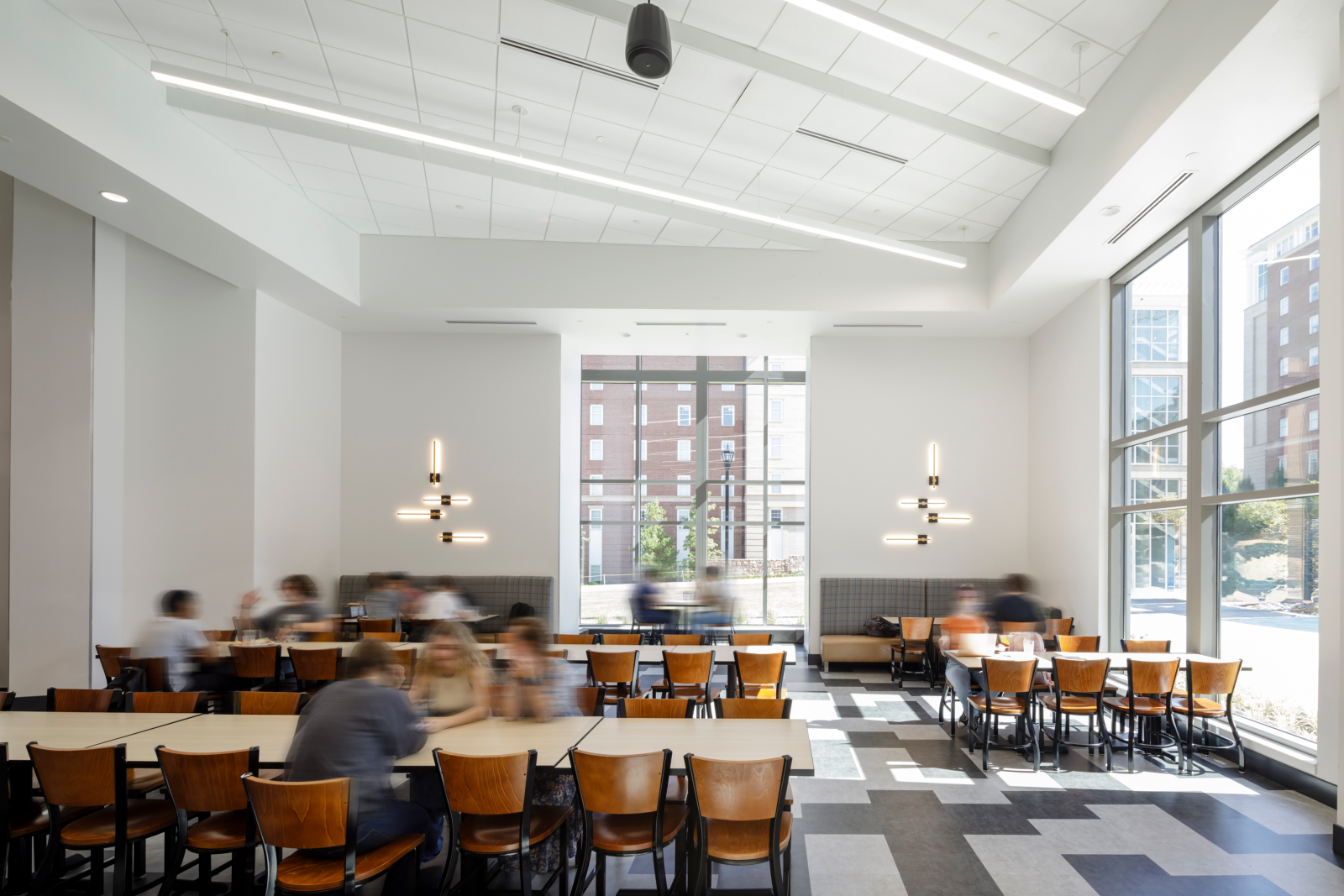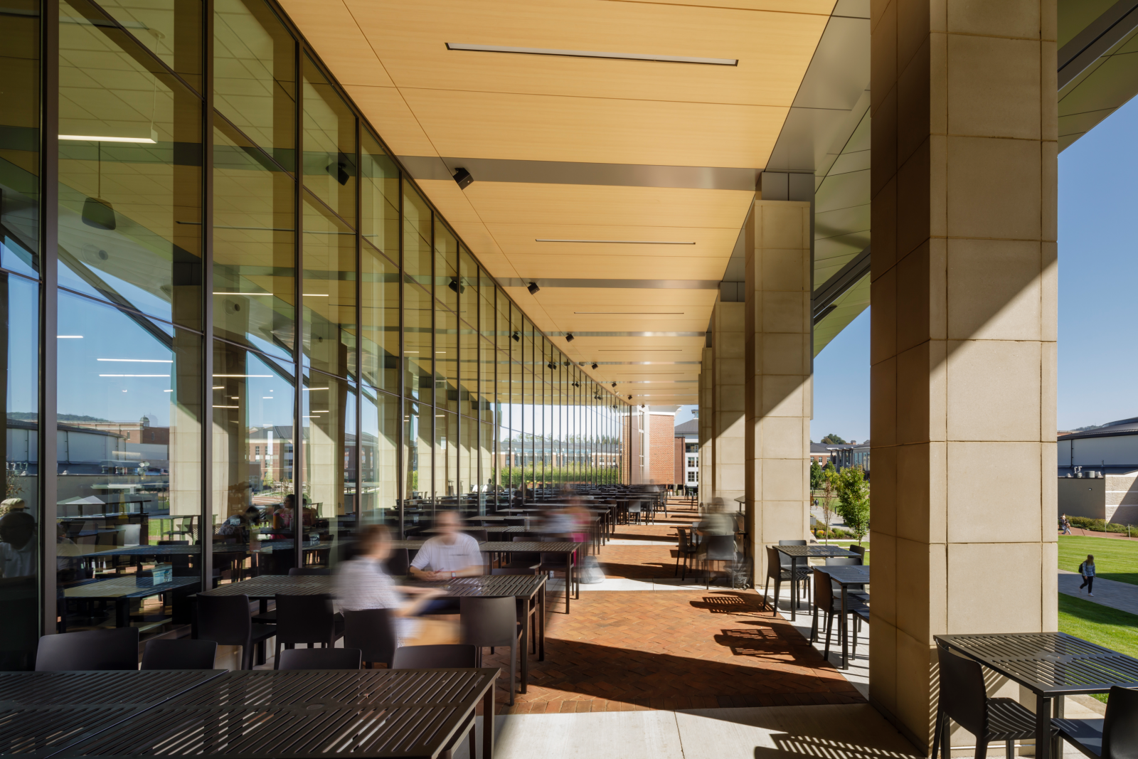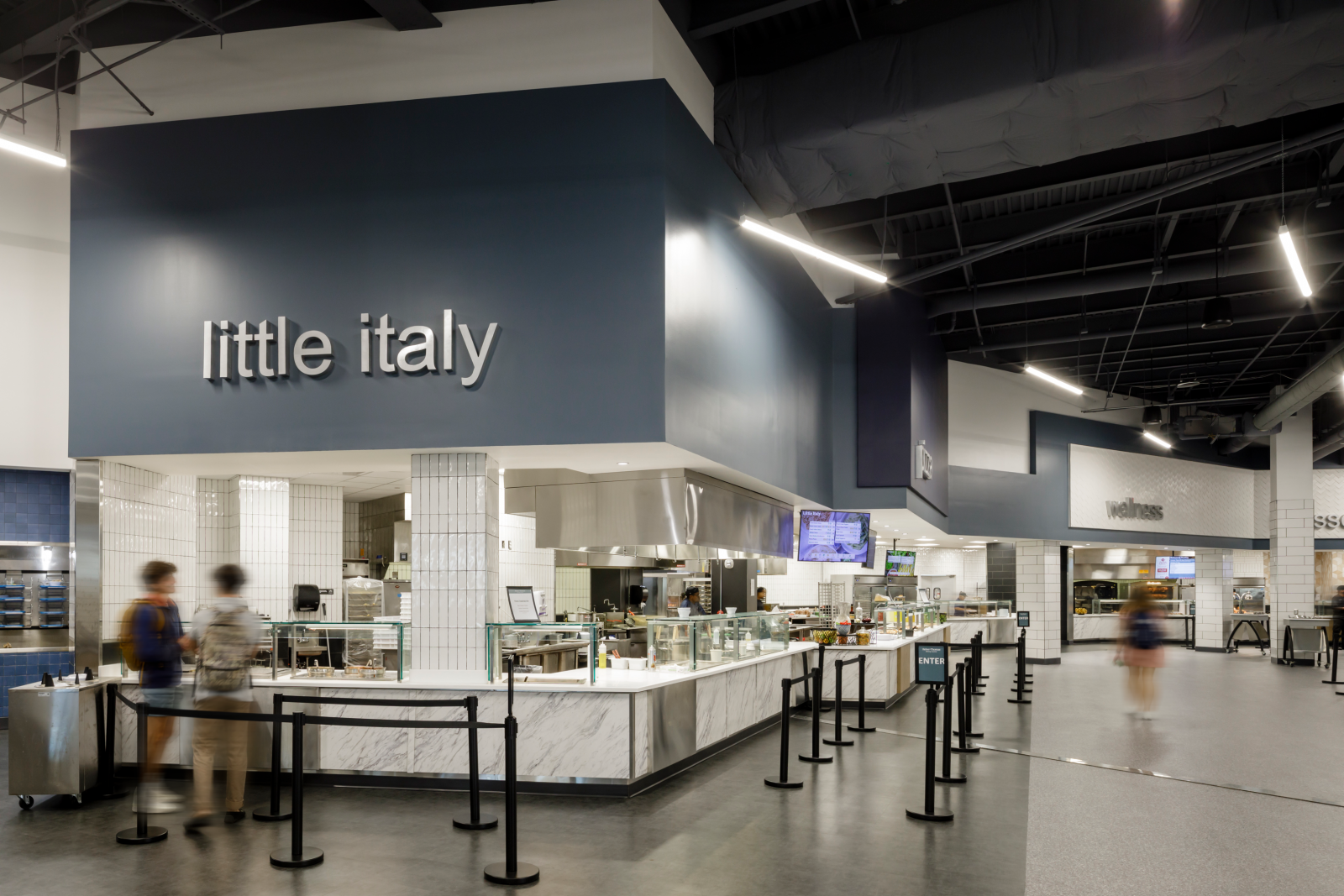 At Liberty University, the two-story dining center features indoor and outdoor seating, along with 28 food service stations. It’s the only dining facility on the university campus and serves the entire student population during breakfast, lunch and dinner. The center also hosts cooking classes and pop-up stations where chefs offer students the chance to try different foods. The dining center includes:
