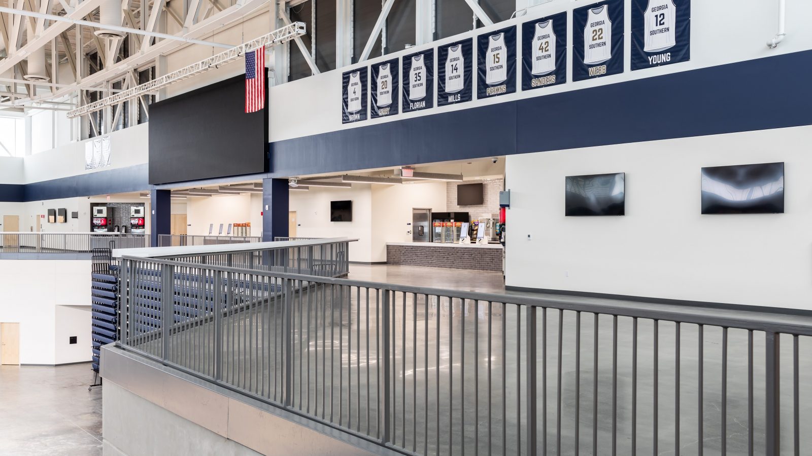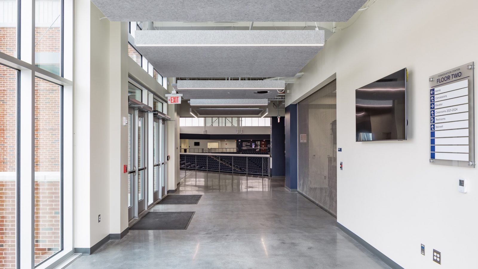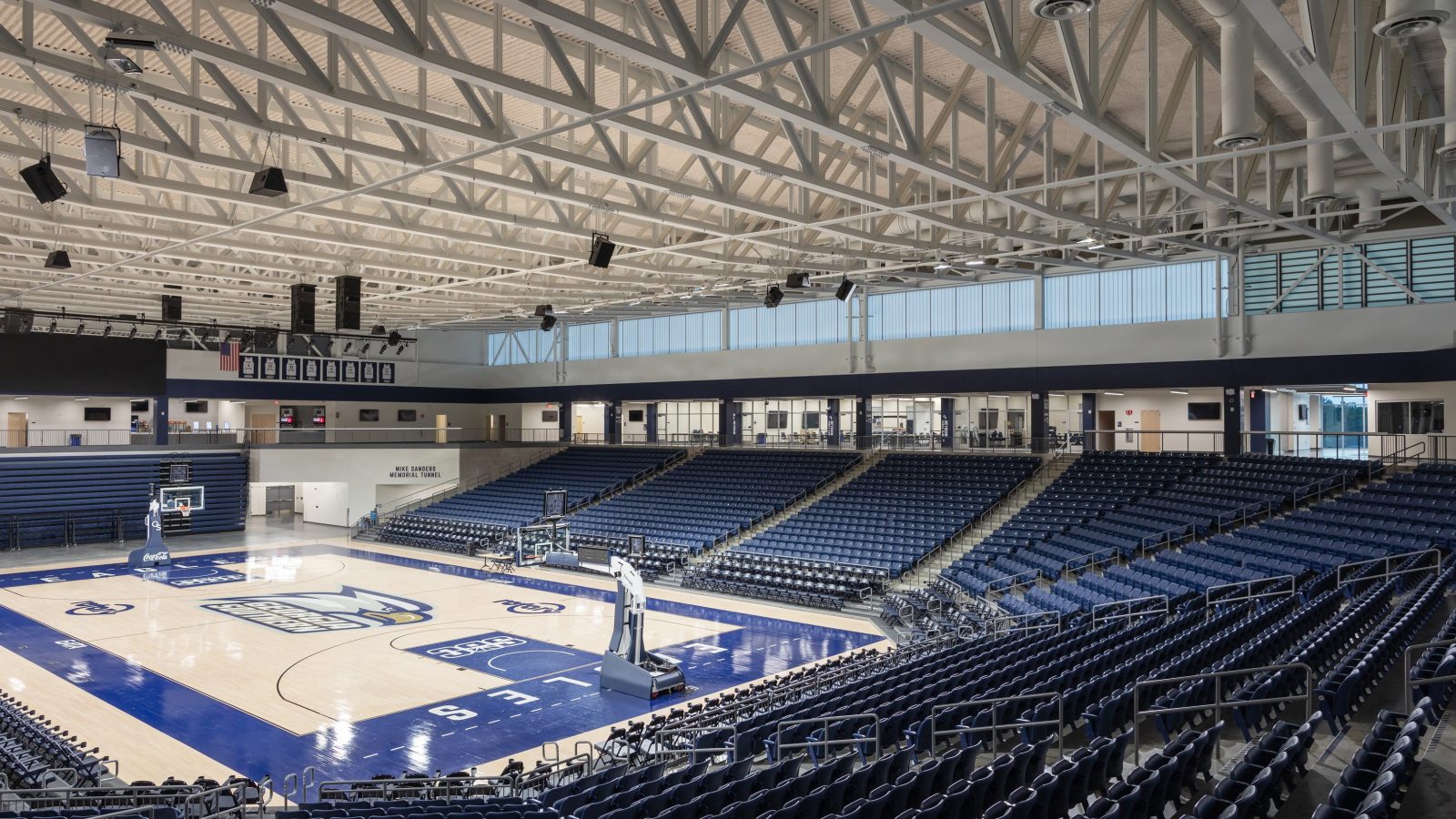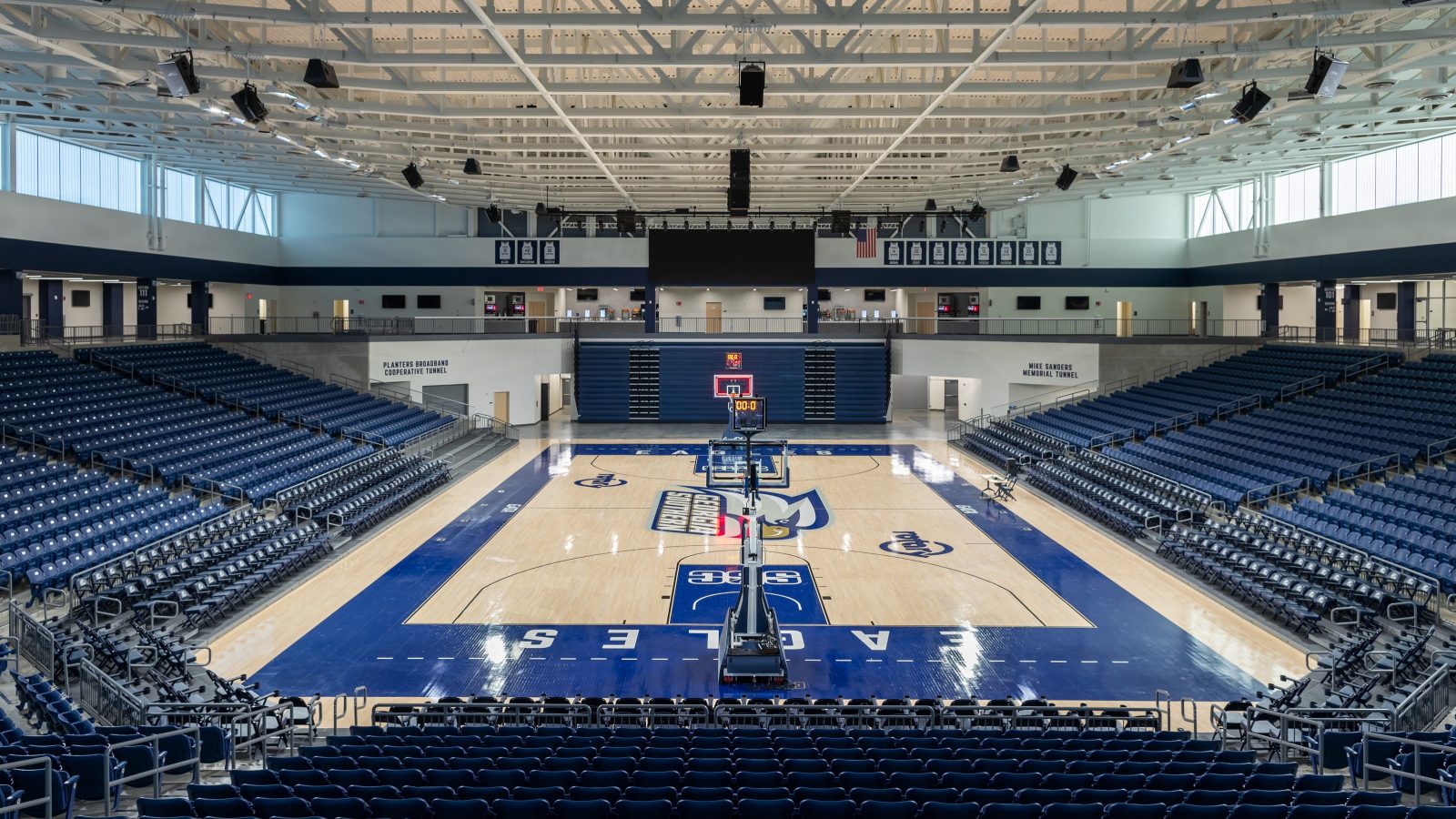 The roof was designed to appear as an eagle’s outstretched wings in flight, which is the school’s mascot. The basketball arena includes designated areas for future expansion, such as premium seating, suites and club spaces.